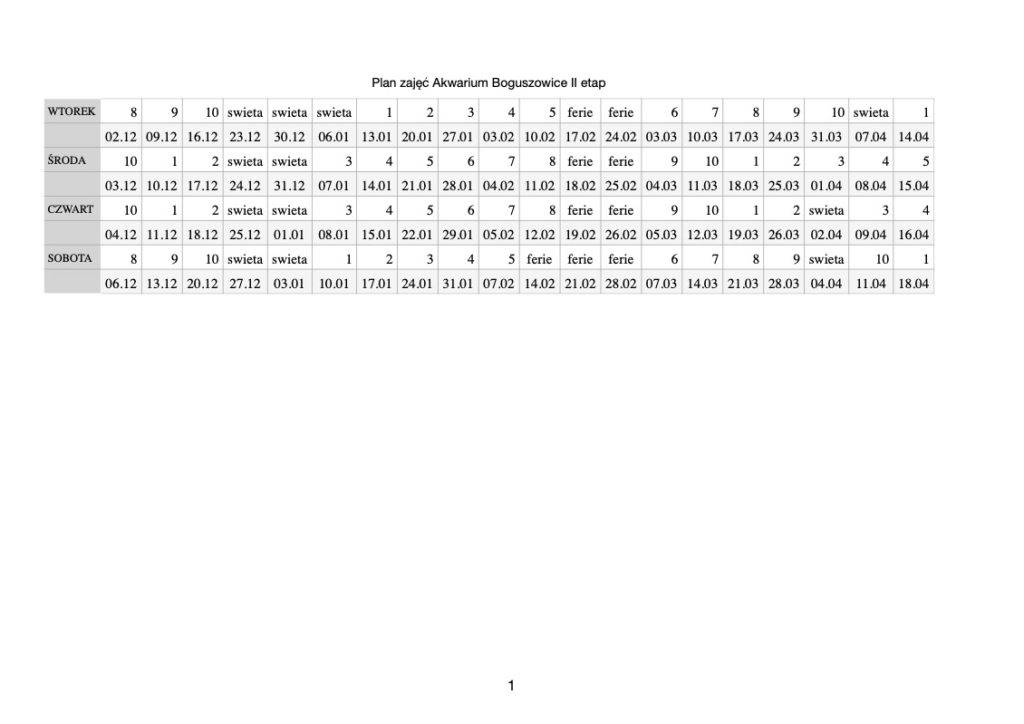 Plan zajęć Akwarium Boguszowice II etap